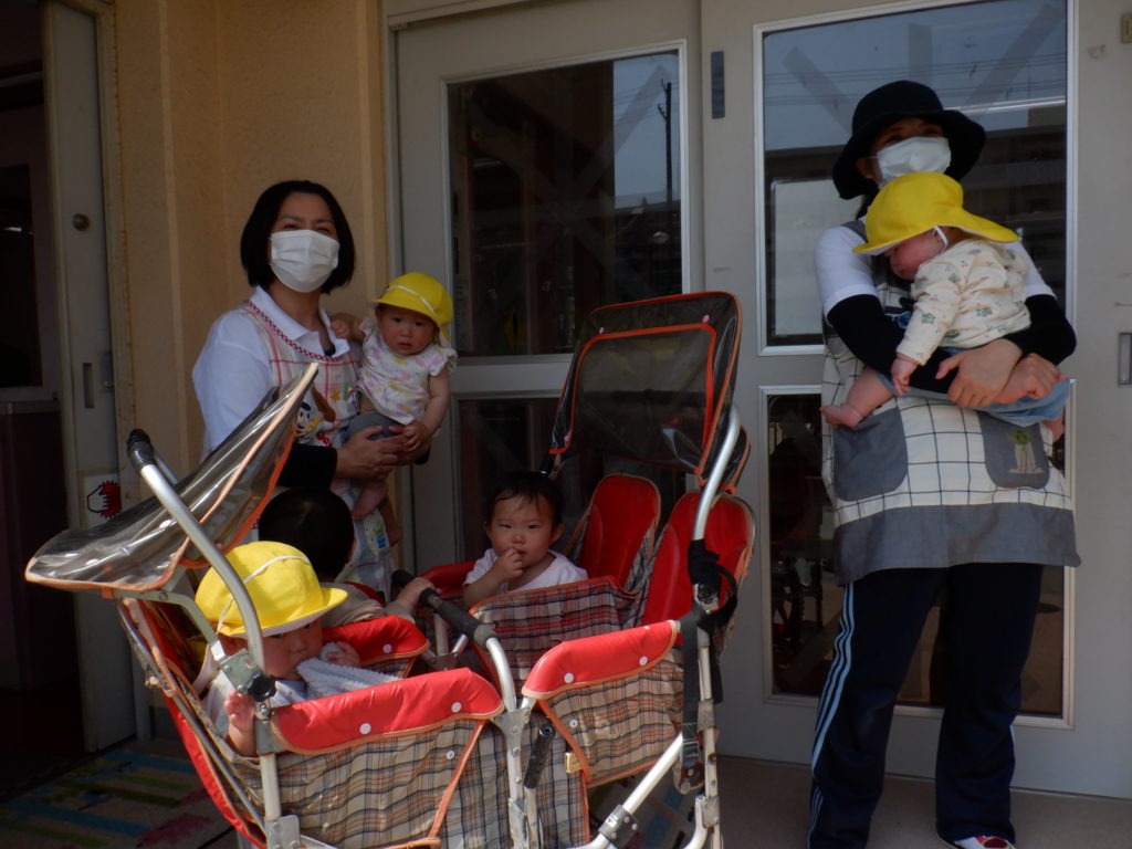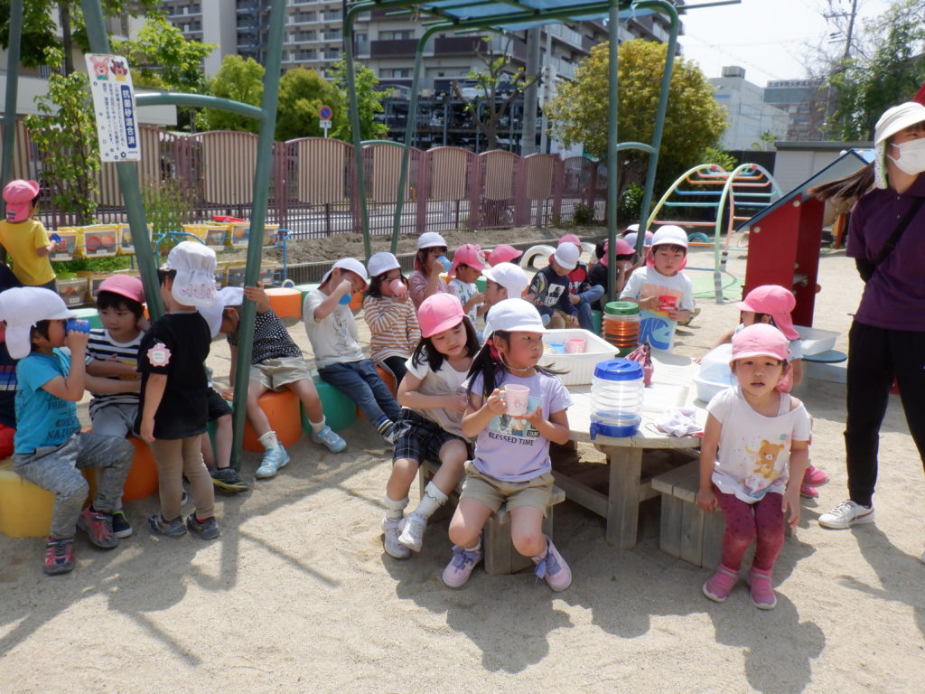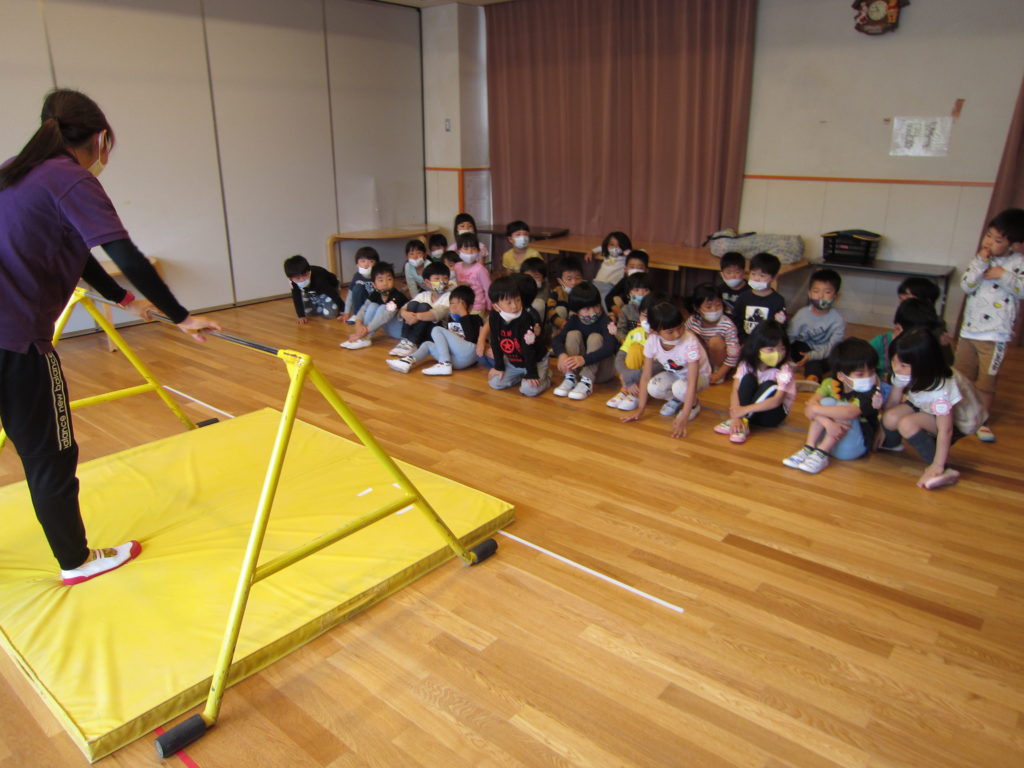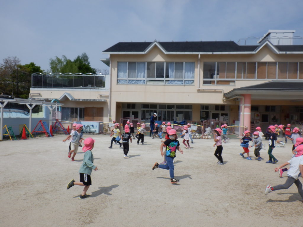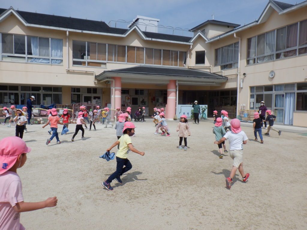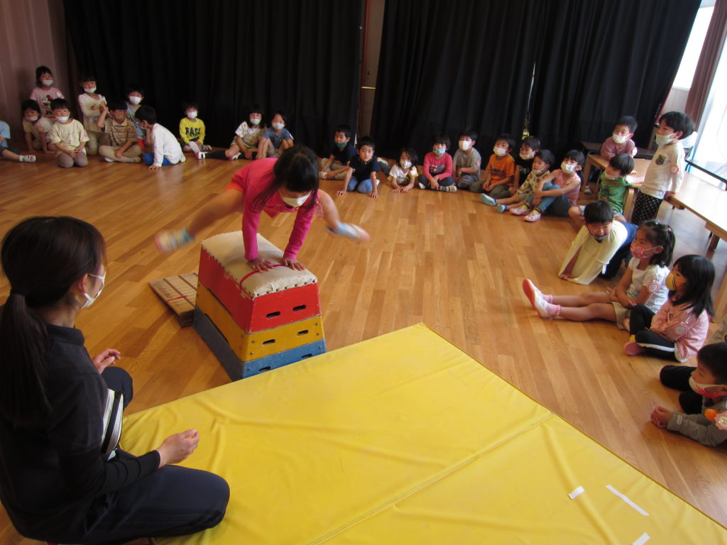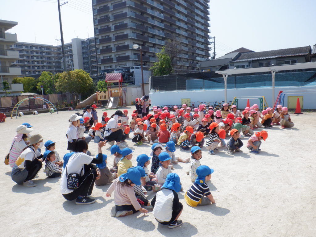 2歳から5歳児さんは、園庭にあつまり、0歳・1歳はテラスからホワイトボードシアターを楽しみました。