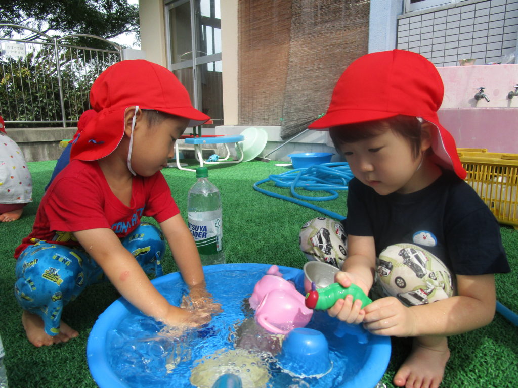 楽しんでいる様子が、表情に出ていますよね★色水遊びも沢山しました。「りんごジュース、めろんジュース、れもんジュース下さい」とジュース屋さんをすると行列ができるほど人気でした!お片付けもとても上手なばら組さんです。保護者の皆様、〇×記入とタオルのご用意のご協力ありがとうございました。夏をたくさん楽しみました♪9月30日で水遊びは終了致しました。