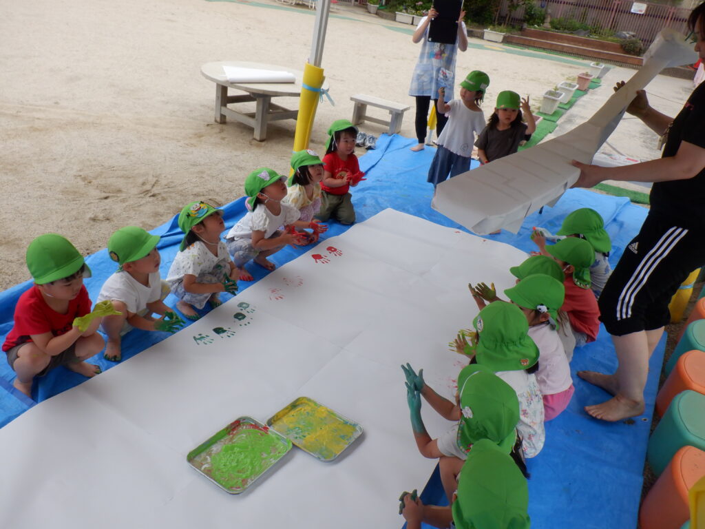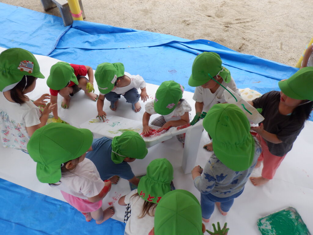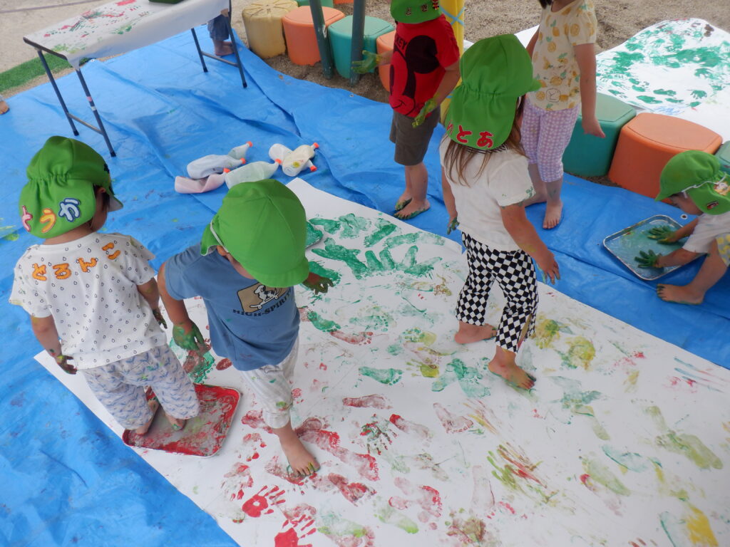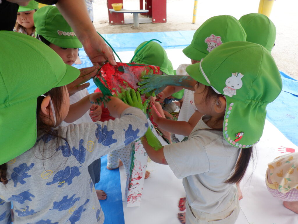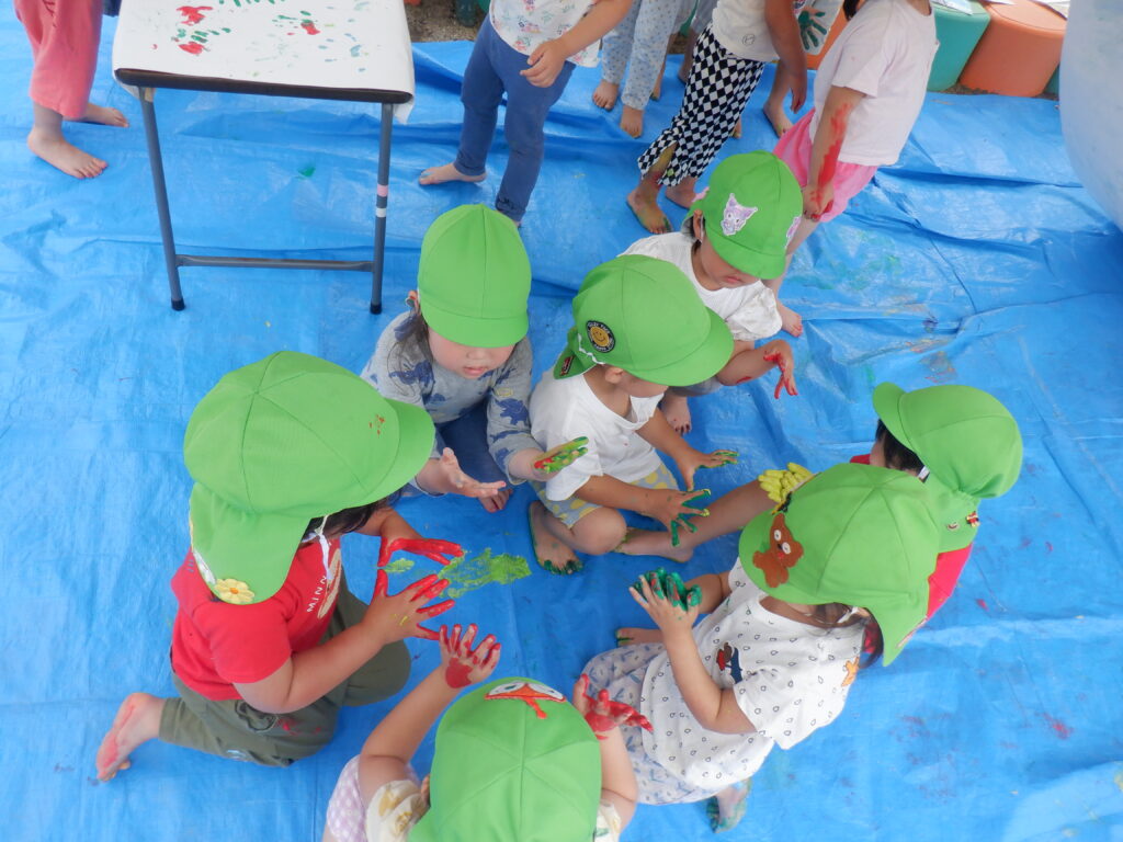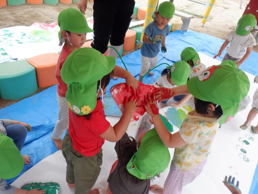 今日は楽しみにしていたボディペイントを行いました。保育者が準備をしている時からにこにこ嬉しそうに見ていた子ども達。 いざ!目の前に絵の具が出されると、周りをきょろきょろ。そして一人が触り出すと、みんな「うわー」「べとべと」などと言いながら楽しそうに取り組んでくれました。