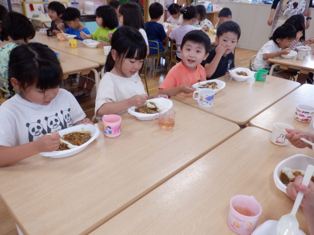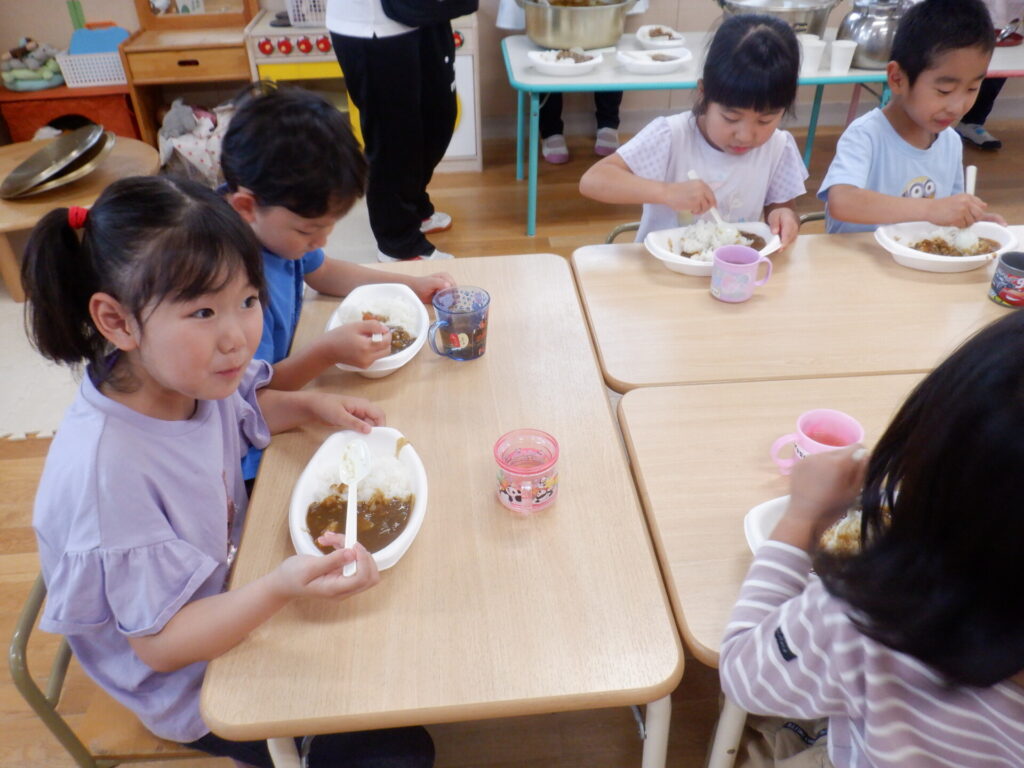 お昼ににんじんを切り、ゆり組のお友だちもお手伝いをしてくたカレーライス。