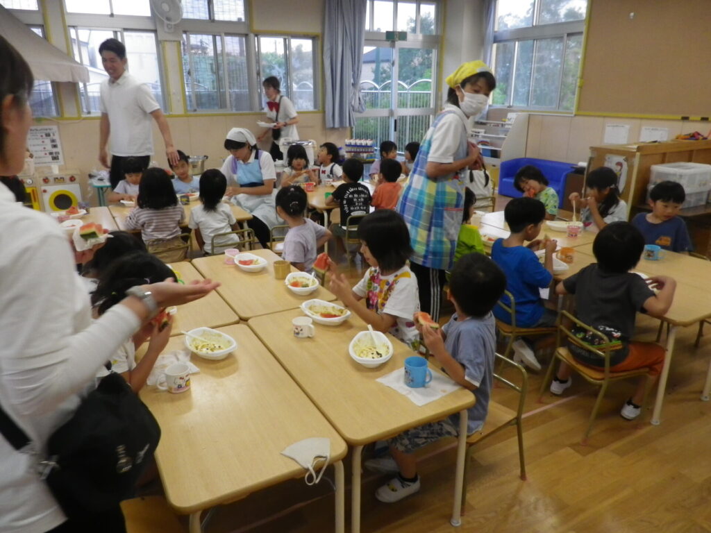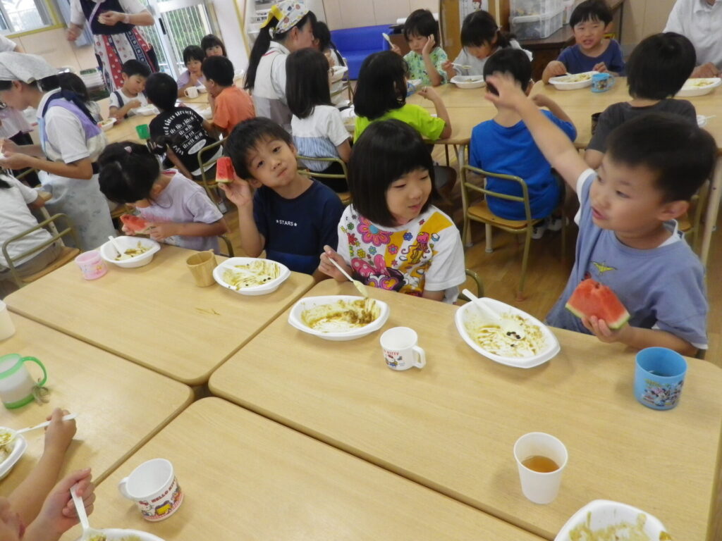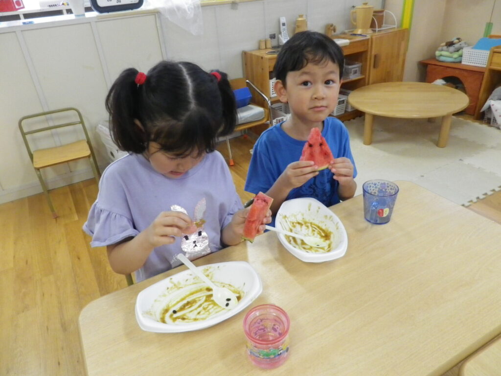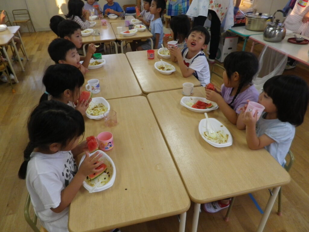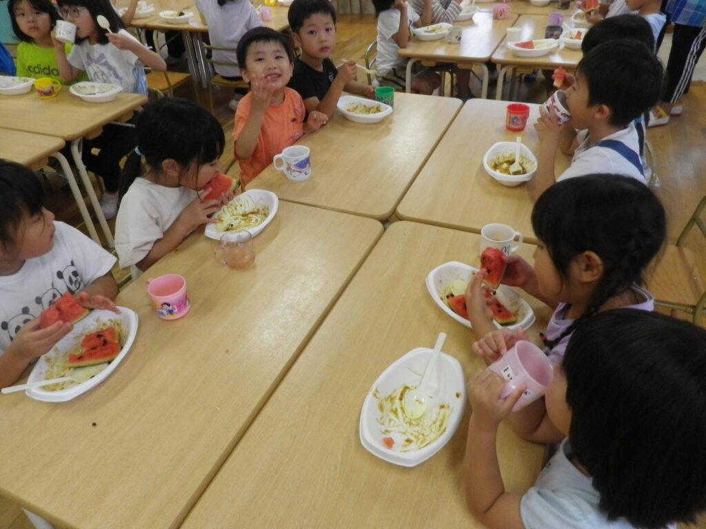 スイカもみんなで食べ、2個3個とぺろりと食べる姿が見られました。
