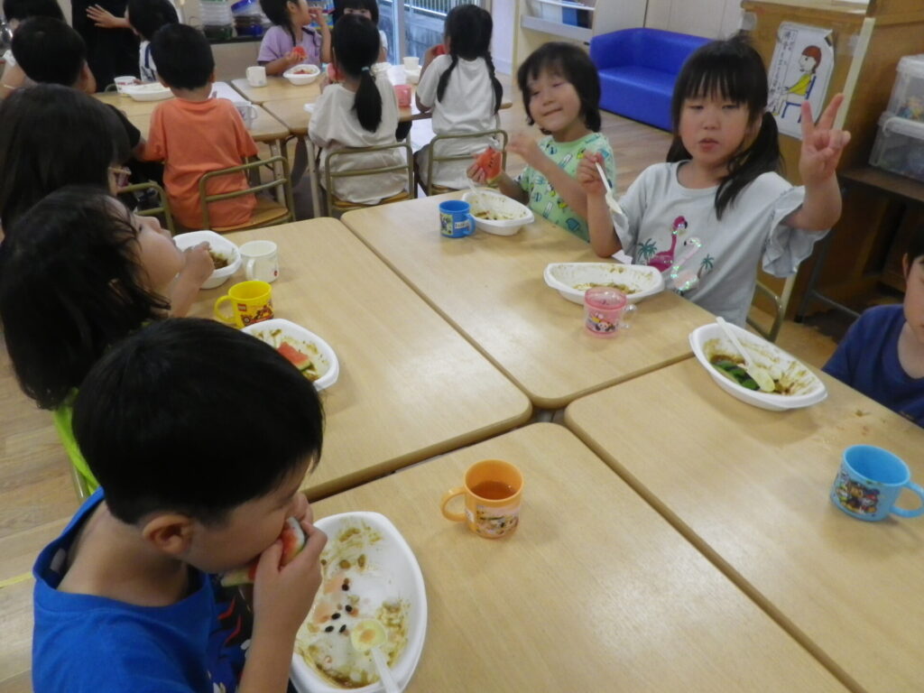沢山遊んだ後にお友だちと食べるカレーライスとスイカは特別です❤