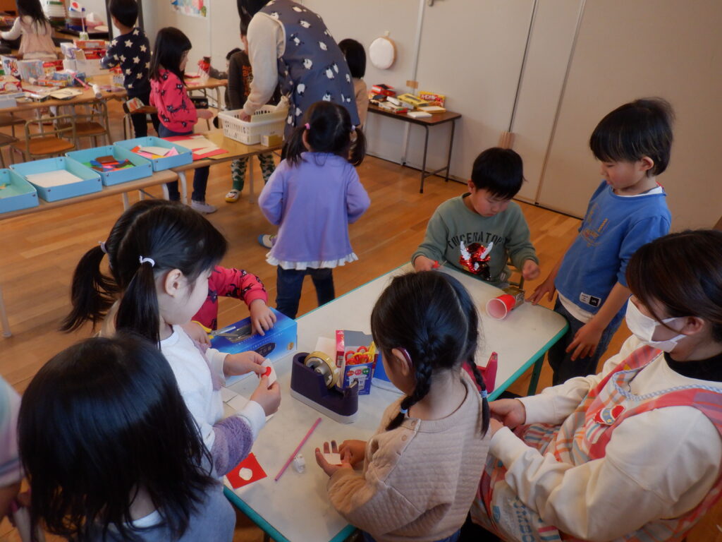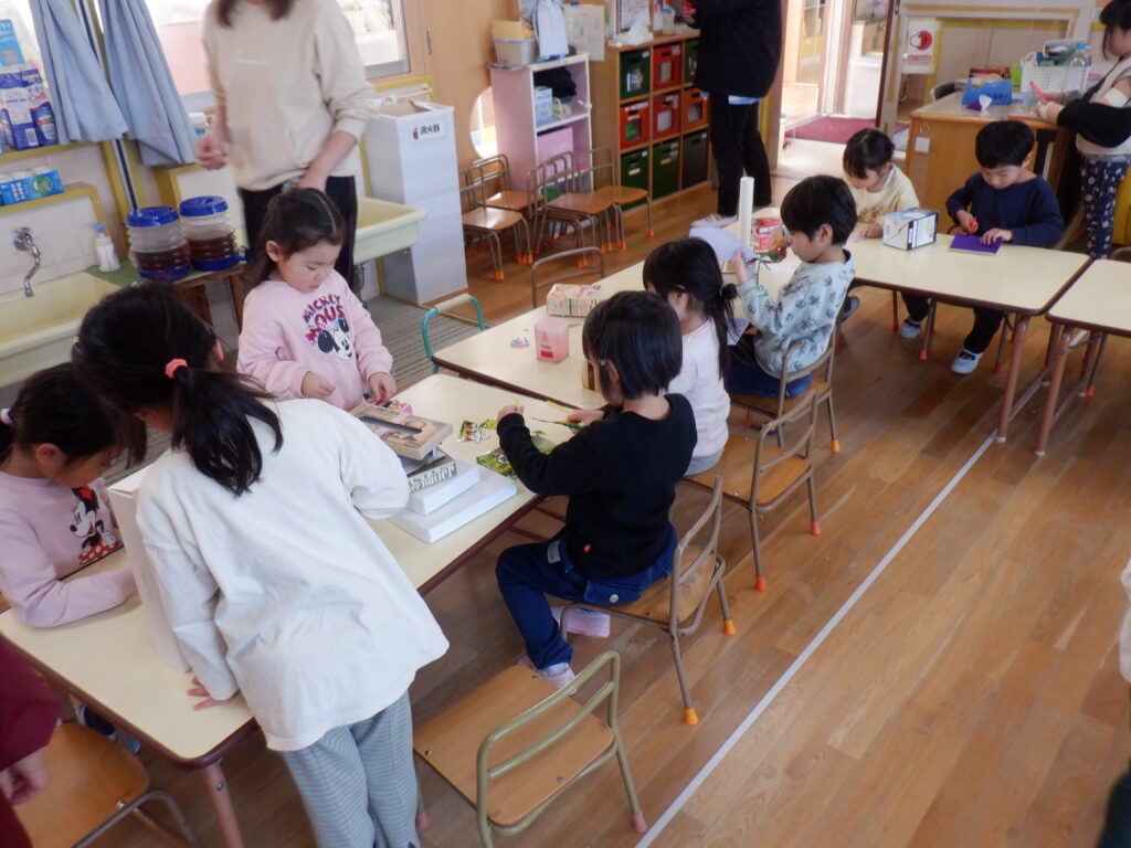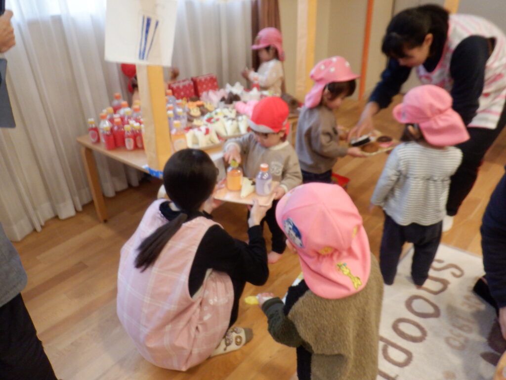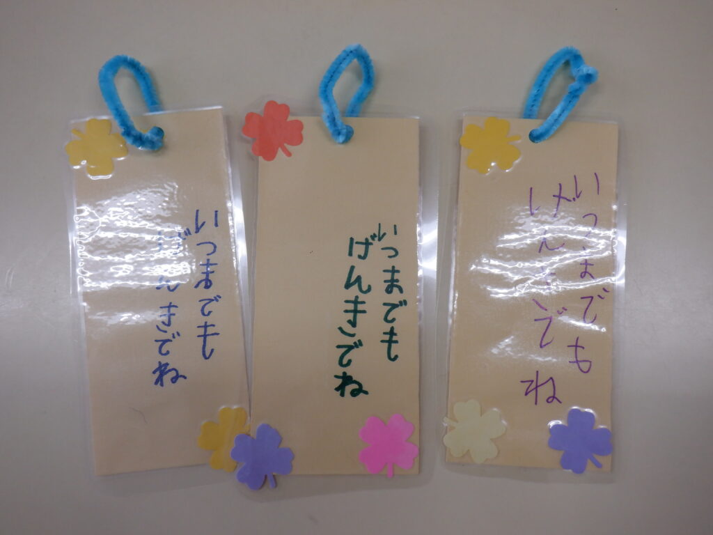 ゆりぐみさんからは手作りのしおりをプレゼント、ちどりさんからは手作りのひな人形を頂きました。