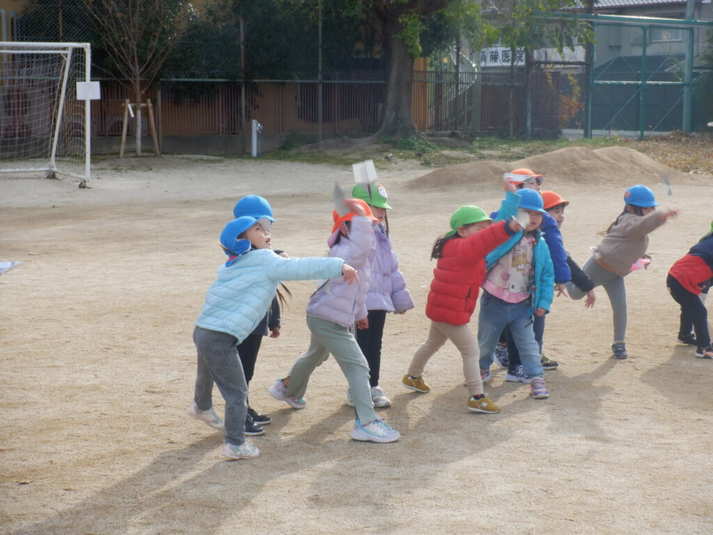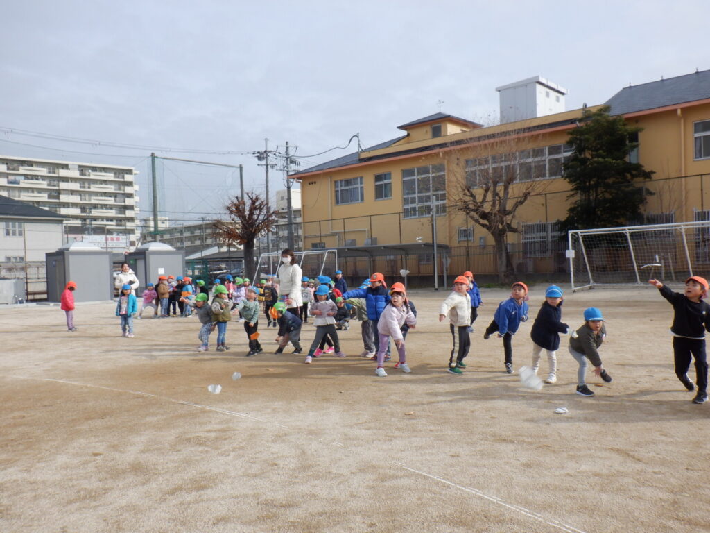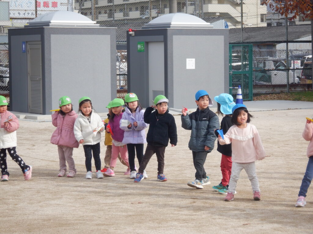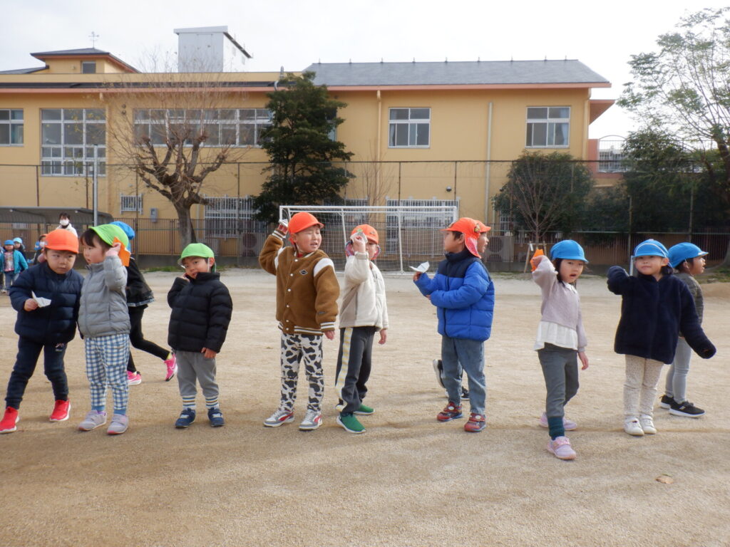 今日は前回ホーム活動で試行錯誤して作った紙飛行機を持ちグラウンドで紙飛行機飛ばし対決を行いました。