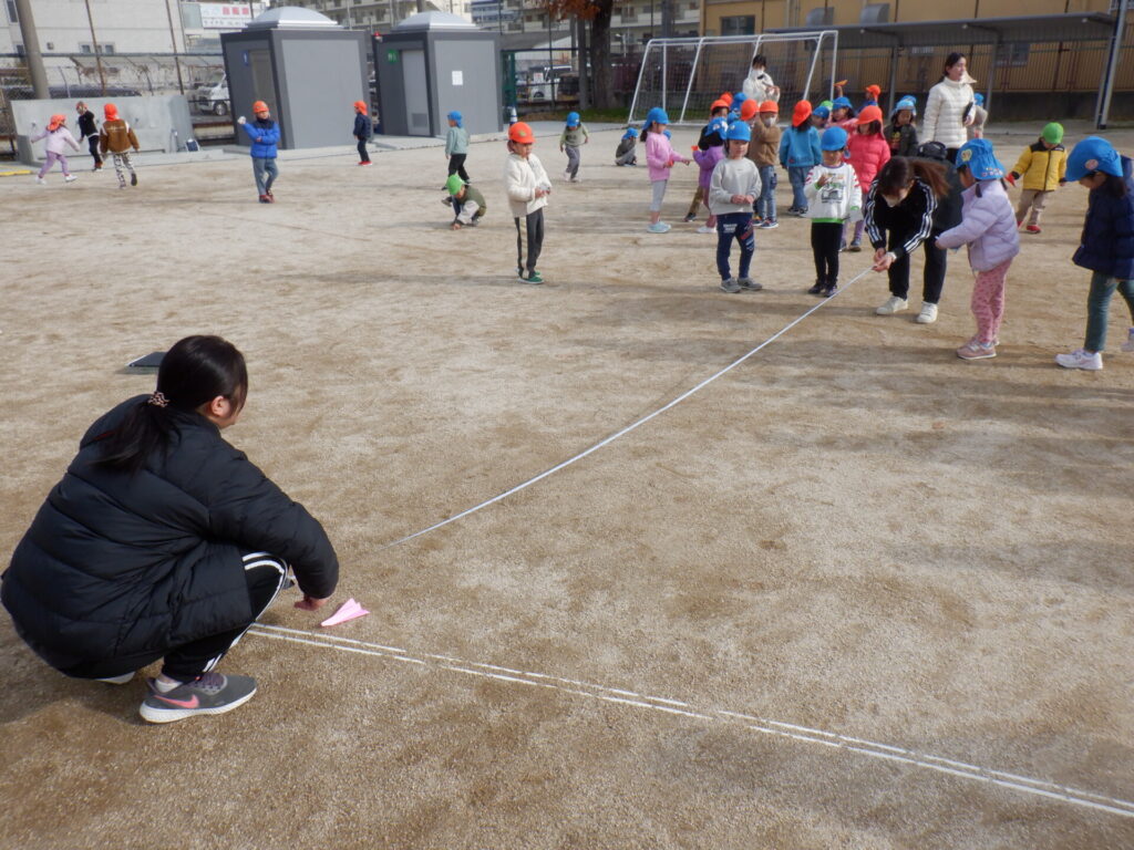 全員3回ずつ投げて、各ホーム1番遠くまで飛んだ子の紙飛行機を保育者が測定しました。