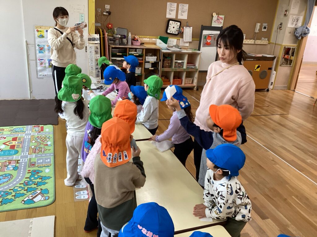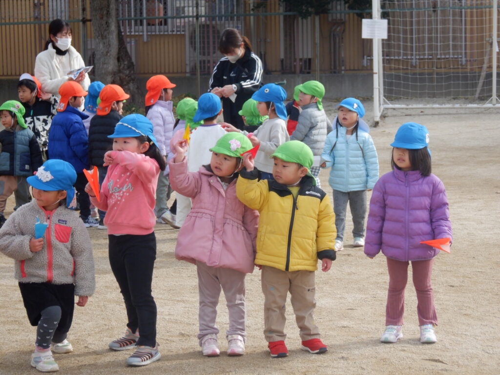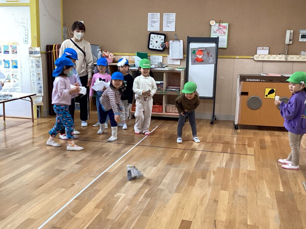 次回の縦割り保育では、ばななホーム・ぶどうホーム・りんごホームで一番遠くまで飛ばせるのかを競う紙飛行機大会をする予定です!