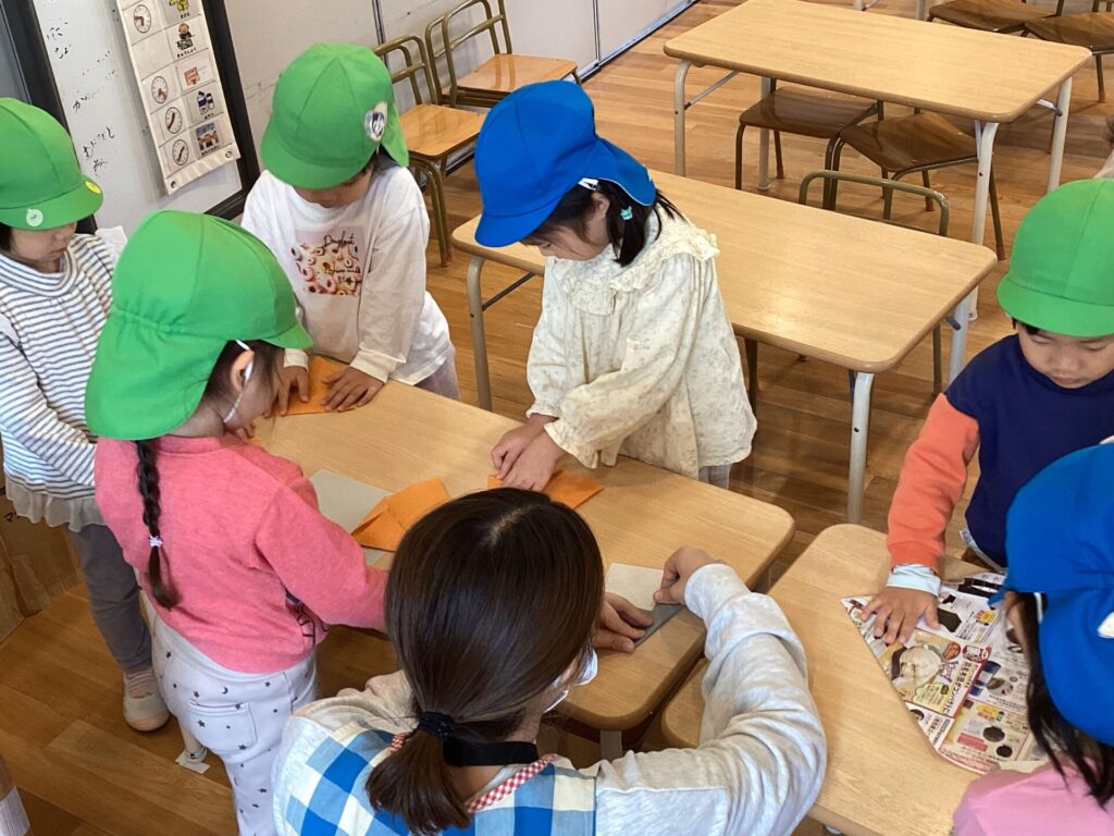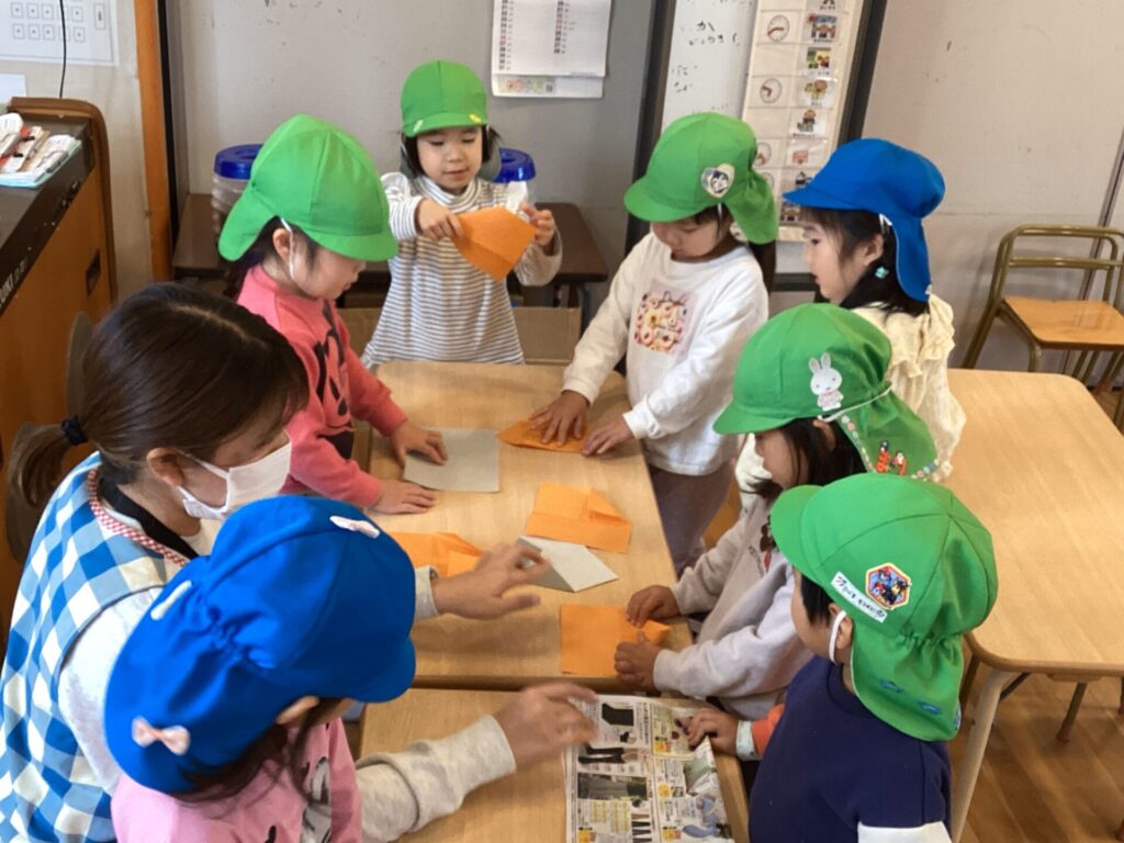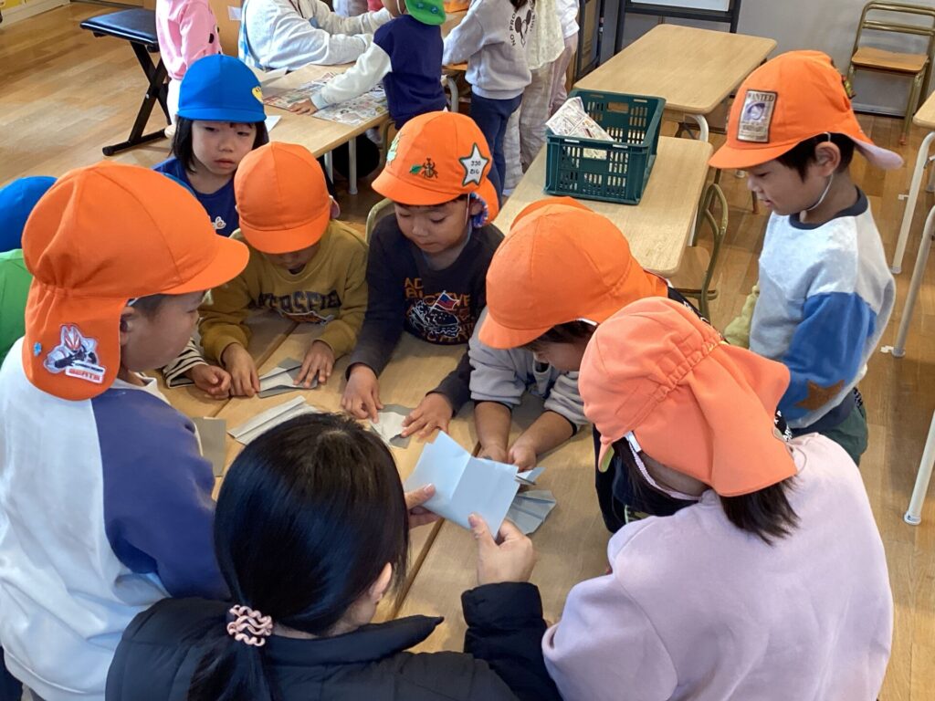 みんなで「どうやったら遠くまでとぶのかな?」「この尖ったところを折ったらどうかな?」とみんなで話しながら折り進めていました。