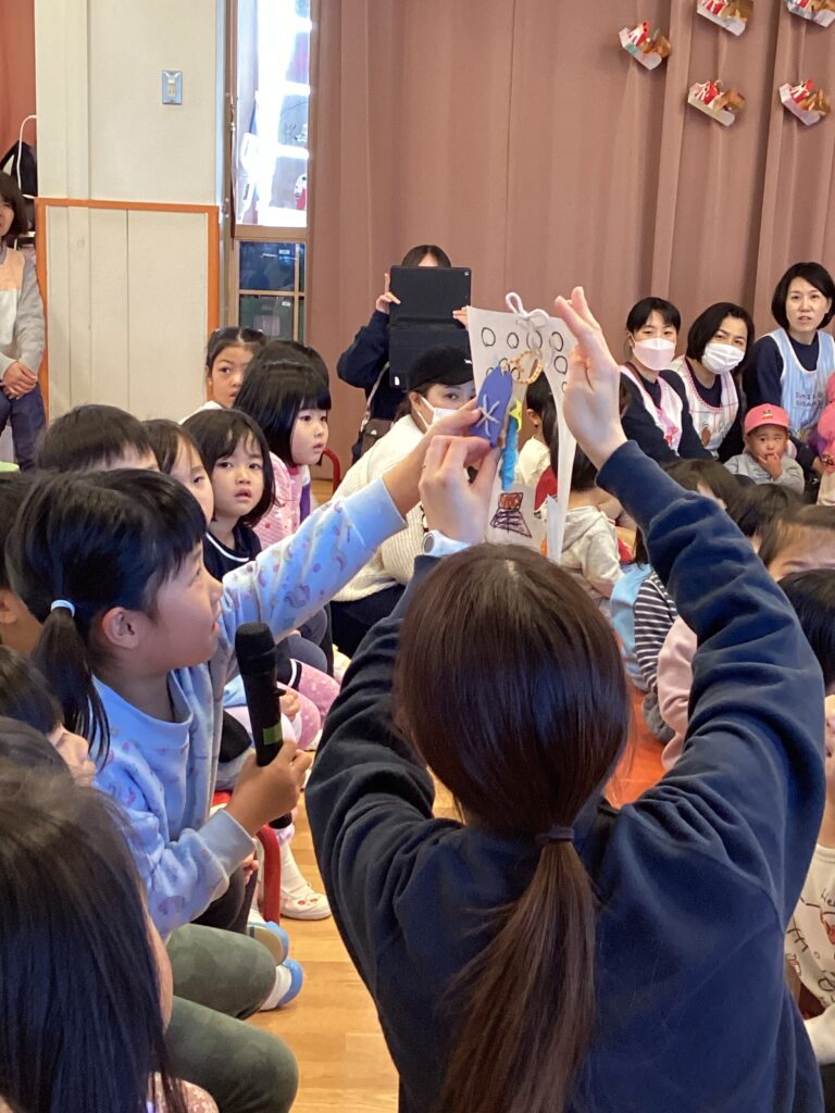 「どんな果物が好きですか?」「どの動物が1番好きですか?」など沢山質問をしました。サンタさんは日本語が話せないので〇、×で答えてくれましたよ。