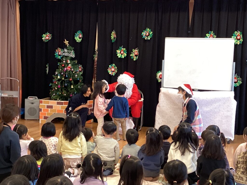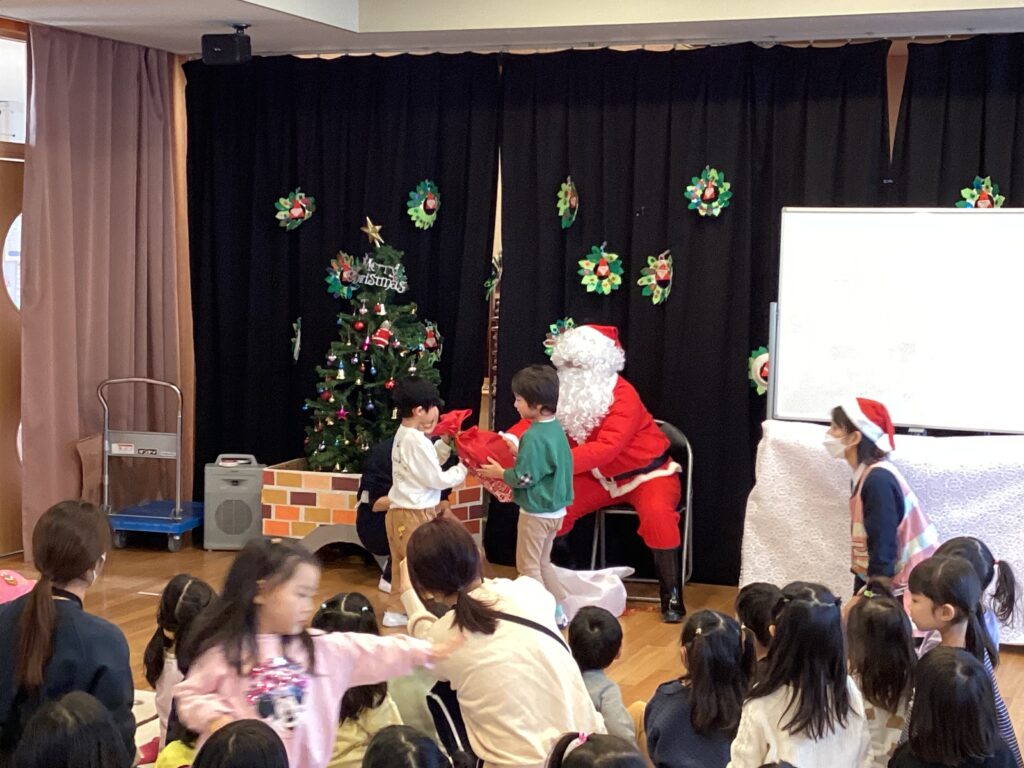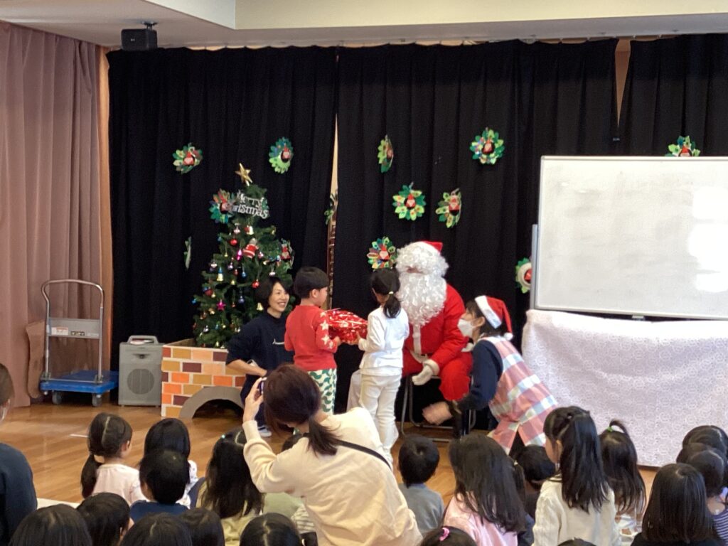 各クラス、サンタさんからクリスマスプレゼントをもらいました。代表のお友達が受け取ってくれました。