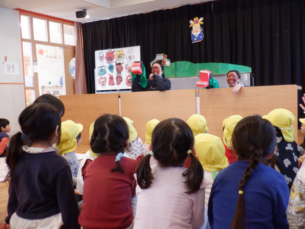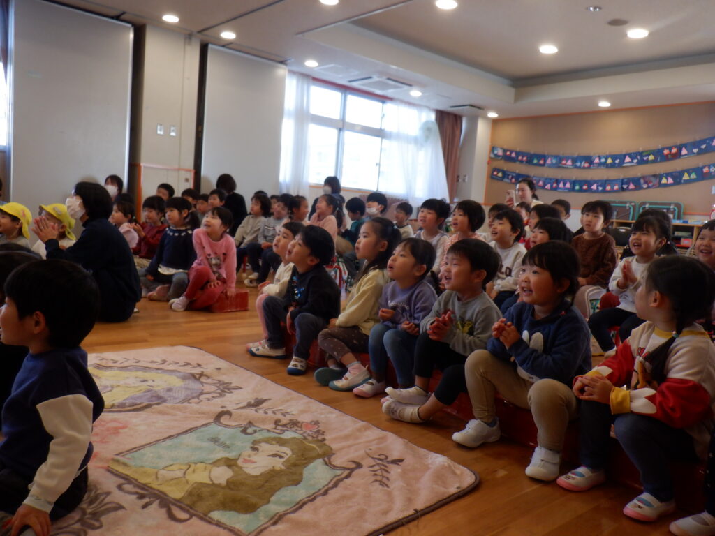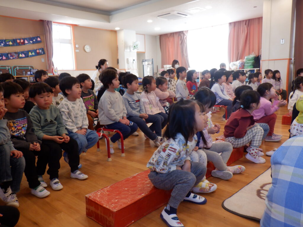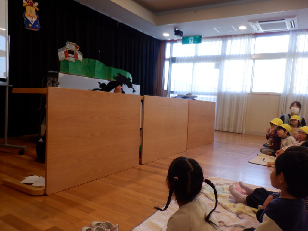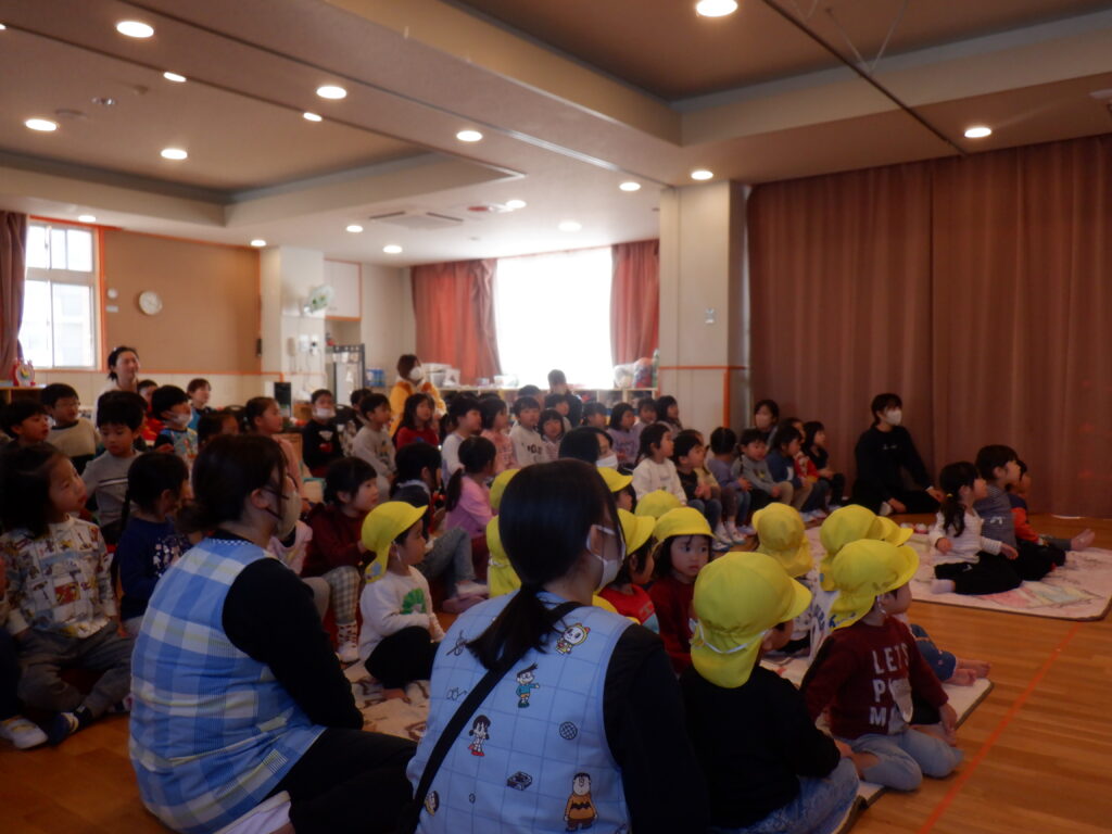 「森のクリスマス」のパネルシアターを見ました。森の動物たちが欲しいものをもらっているのを見て 茨田大宮こども園にもサンタさん来ないかな~?という声が聞こえて来ました。