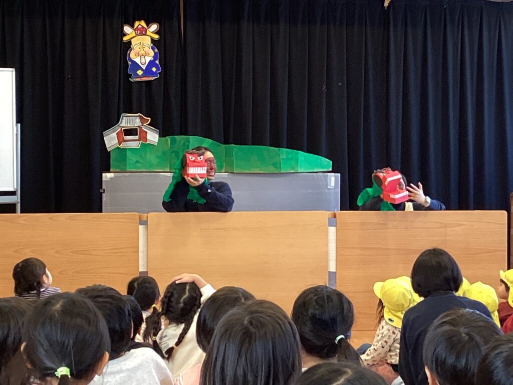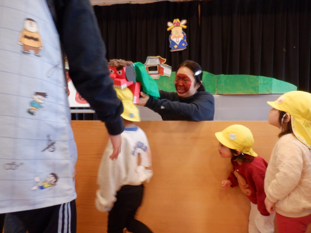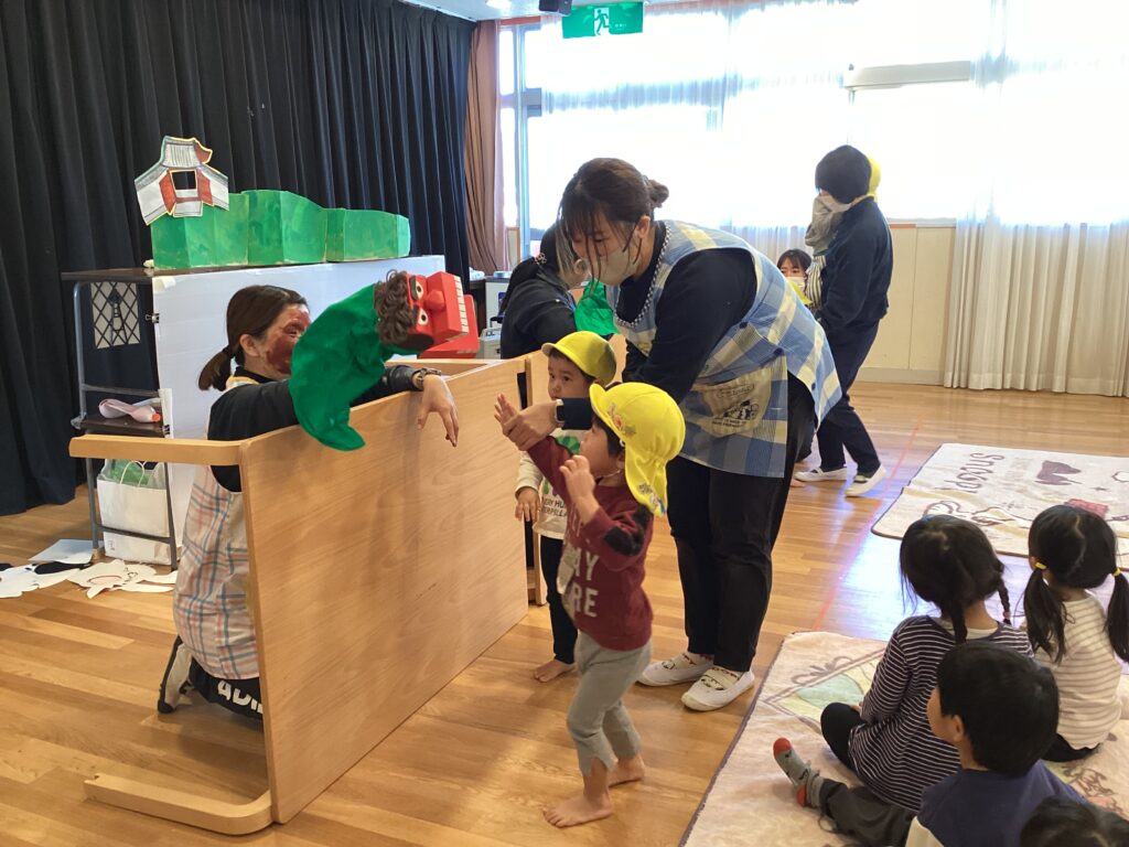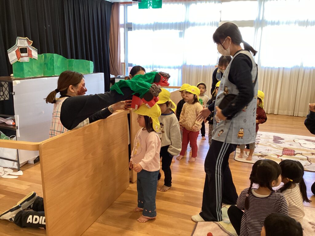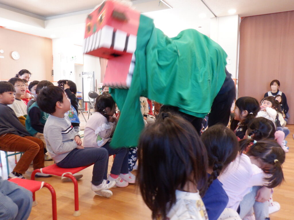 次にやってきたのは、大きな獅子舞。 頭を噛まれると一年元気に過ごせて、頭も良くなるんだよ 、と教えてもらいましたが、少し怖くて泣いてしまう子もいました。