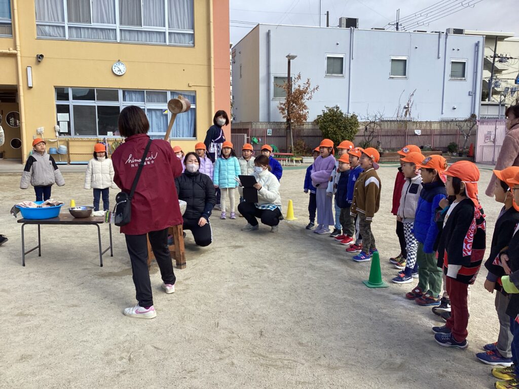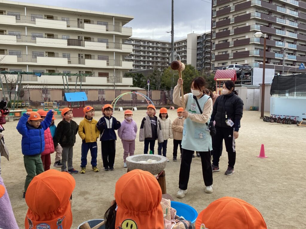 各クラス順番に園庭に降りてきて、寒さに負けないくらい元気な掛け声で「よいしょー!」と言いながら全員お餅をつきましたよ。